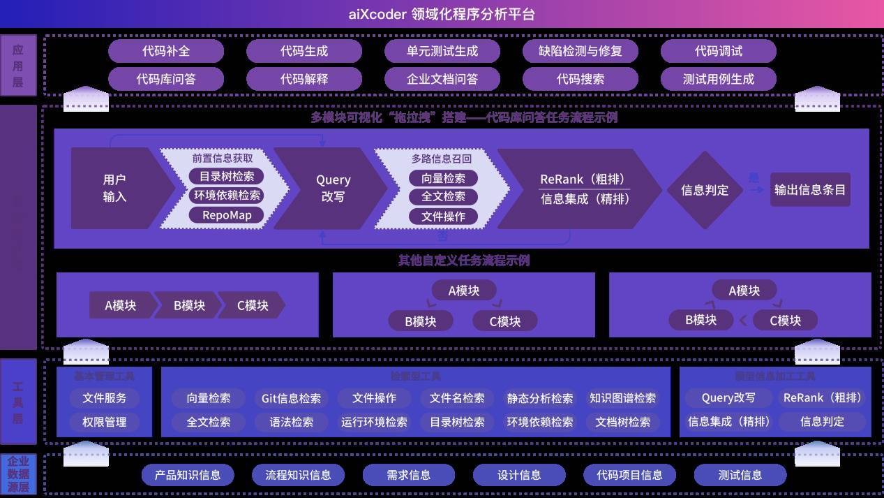 领域化程序分析平台构建。产品深度绑定企业业务场景,高效整合企业复杂多样的私域数据和知识,通过软件工程工具集,将其转化为符合企业业务逻辑和流程的高质量上下文。在此基础上,依托动态智能工作流,在恰当的节点,把最有效的信息和工具提供给大模型,支撑其更高效、精准地完成复杂软件开发任务。